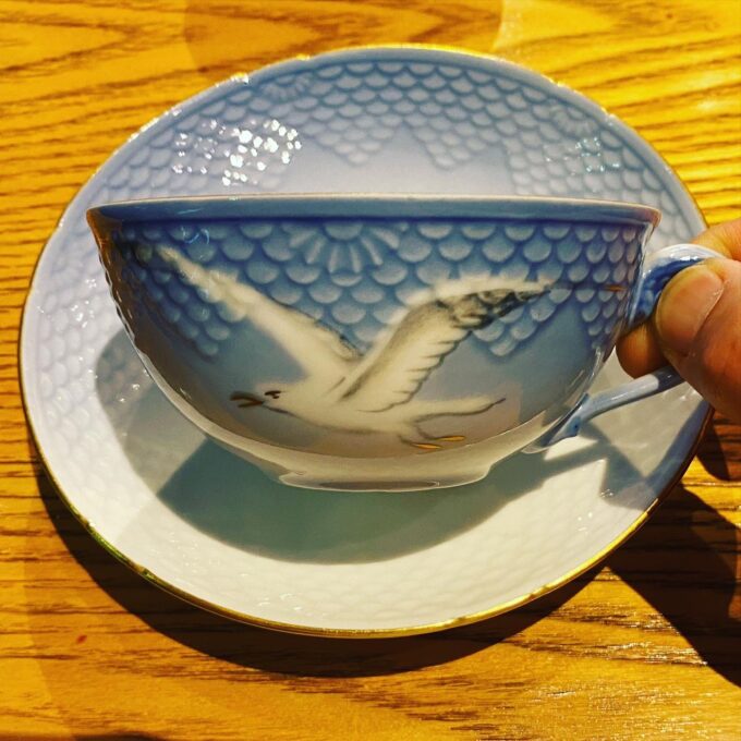 今は無きビングオーグレンダール社の代表的なデザイン。1895年から作り続けられてきたデザインで、カップやソーサーの縁には縄文が施され、大空をゆったりと飛ぶカモメが描かれています。ブルーから白へとつながるグラデーションが他にはなく素敵です。ロイヤルコペンハーゲンと共に「B&G」と記載があれば、それはビングオーグレンダール社製の希少な品物です。
